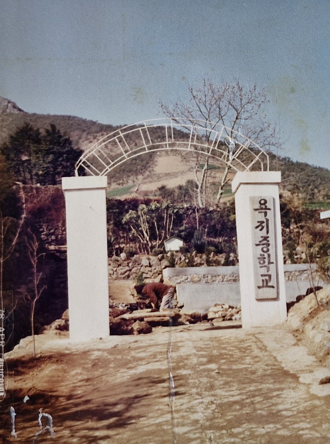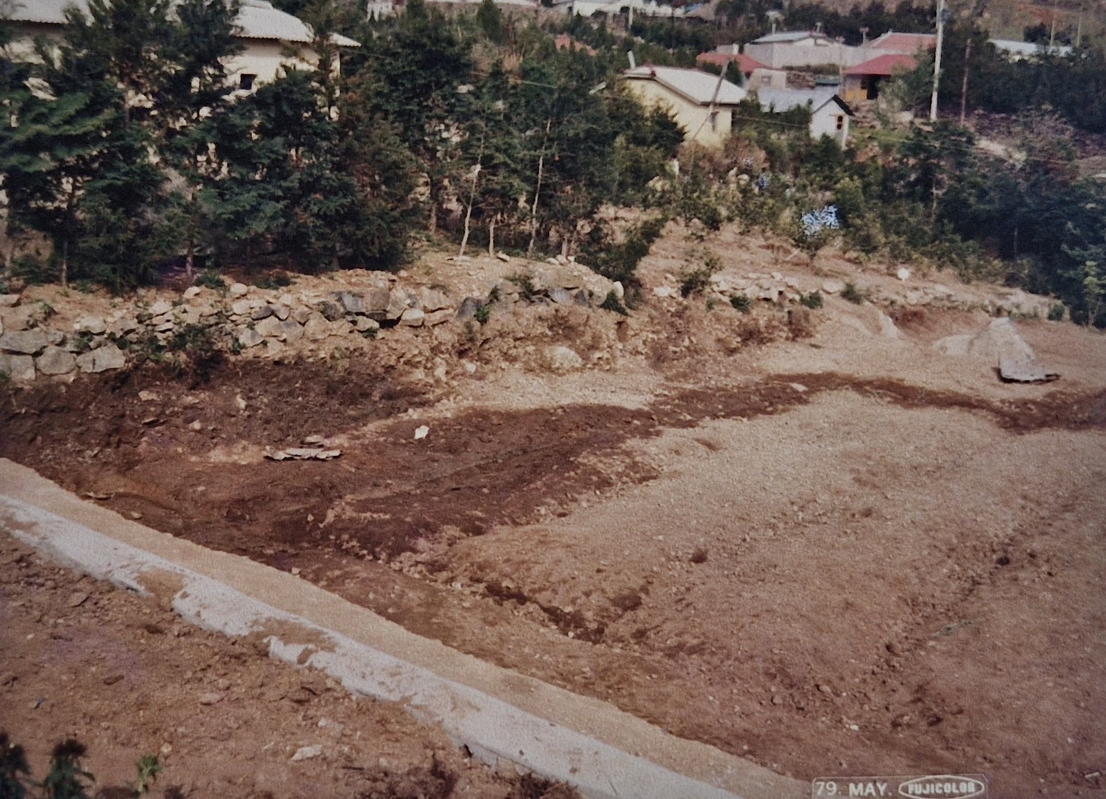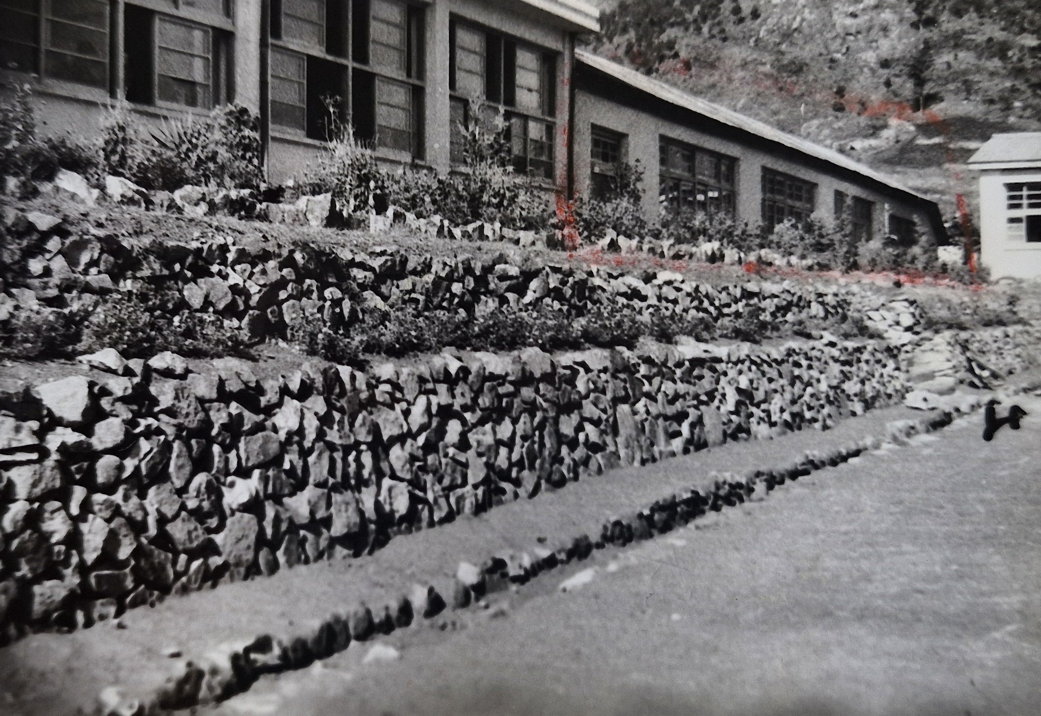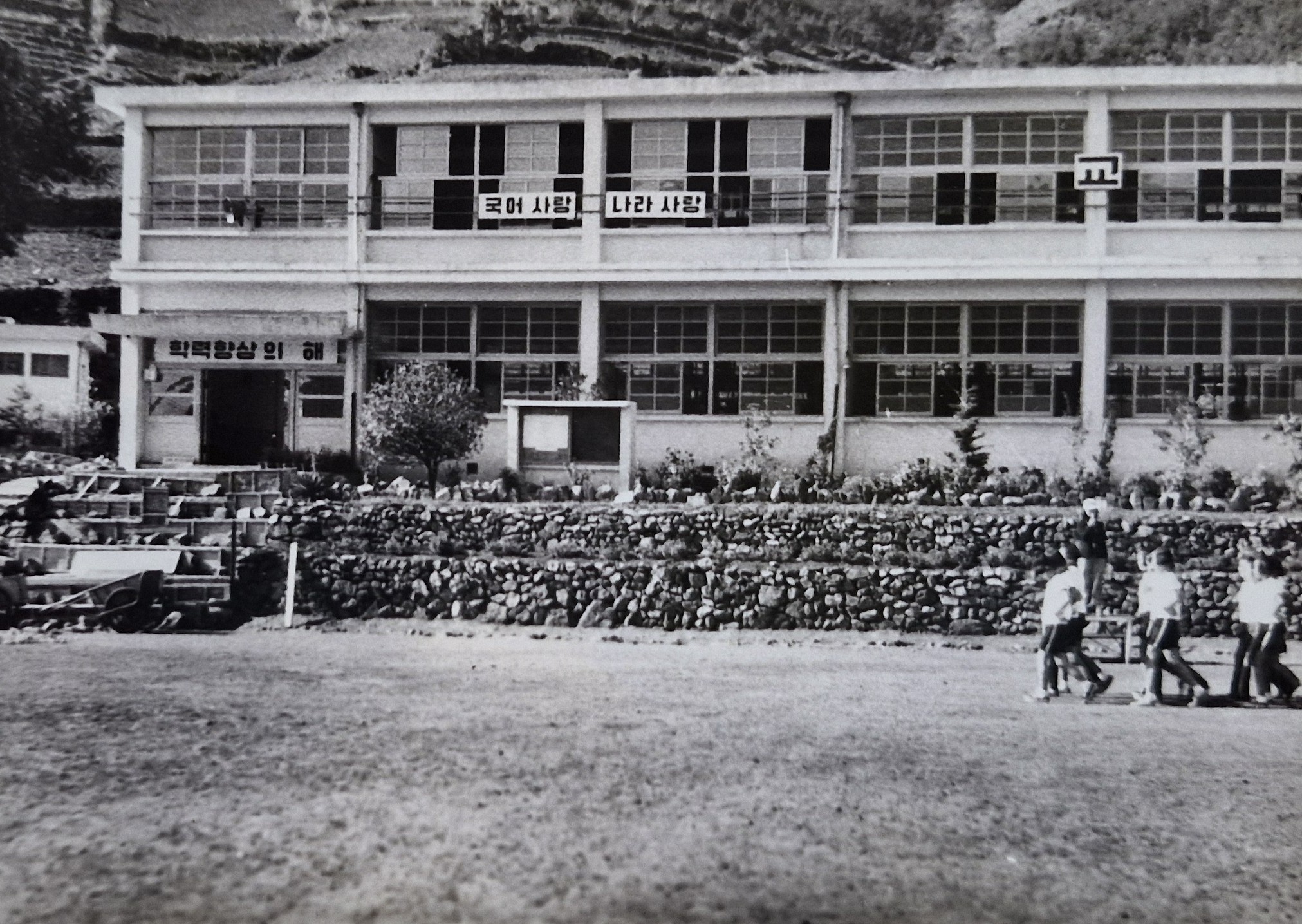 <1976. 5. 운동장 확장공사이후 교사전면 석축으로 정비>